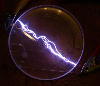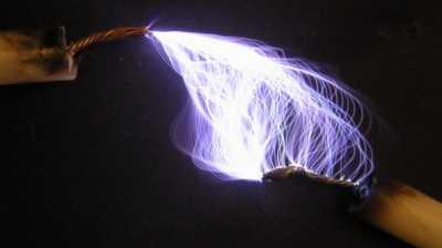 Электроды раздвинуты чуть дальше, чем способно пробить. В результате образовался красивый факел коронного разряда. |