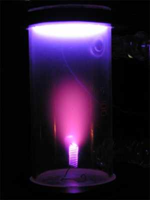 Тлеющий разряд в воздухе, постоянный ток. Факел, что идет вверх от спиральки, - положительный столб. Вверху - голубое прикатодное свечение. |